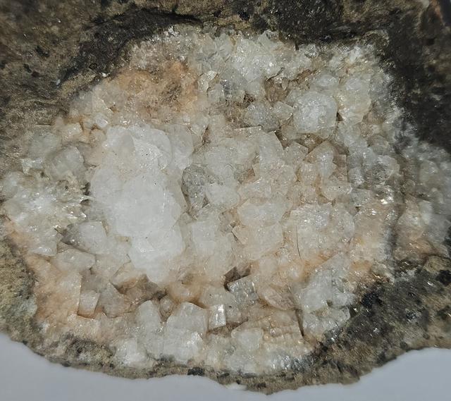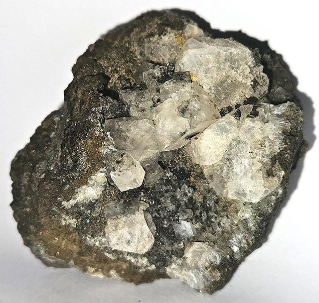 [Glassy Transparent Euhedral Crystals with Calcite on Basalt]