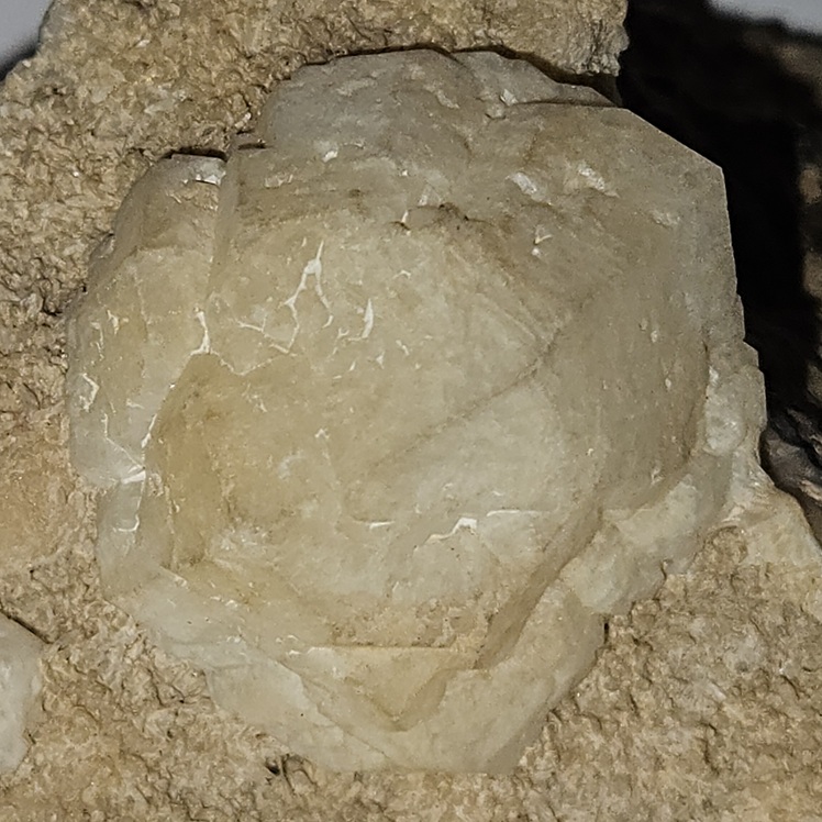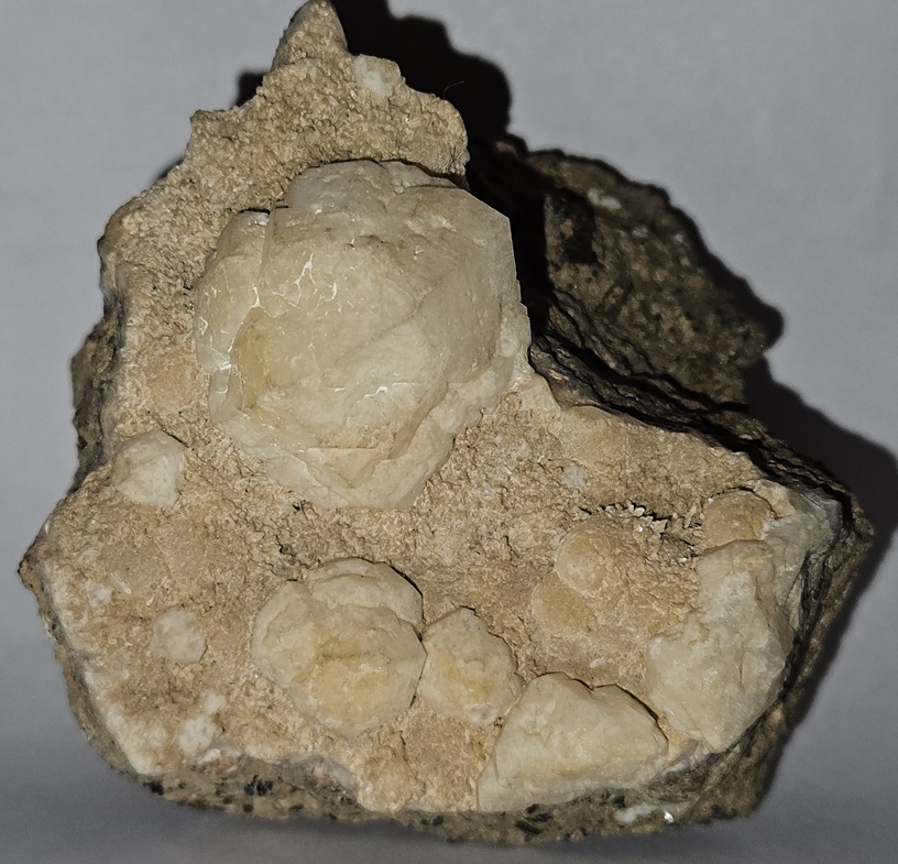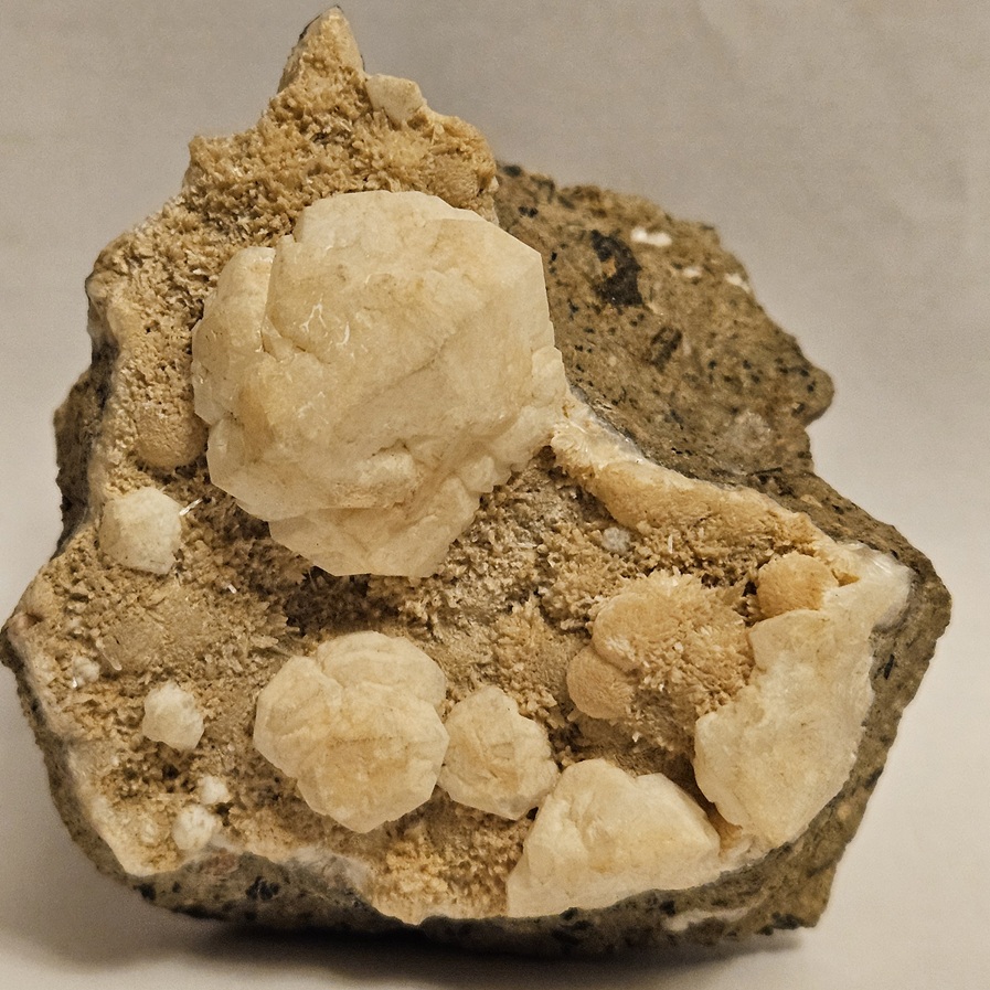 [Sharp White Euhedral Crystals with Drusy Tan Stilbite on Phonolite Porphyry]