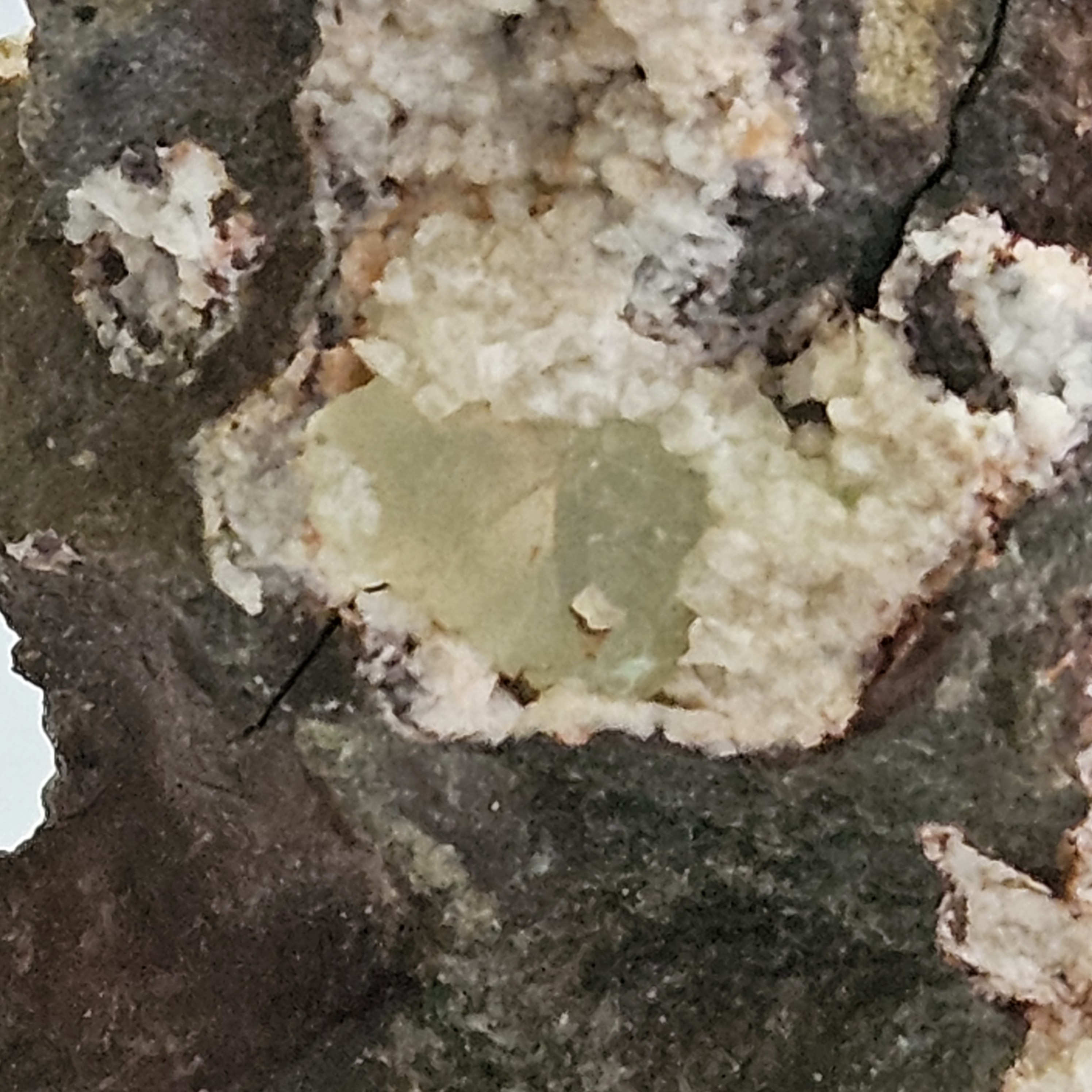 [Glassy White Crystals with Prehnite in Basalt]