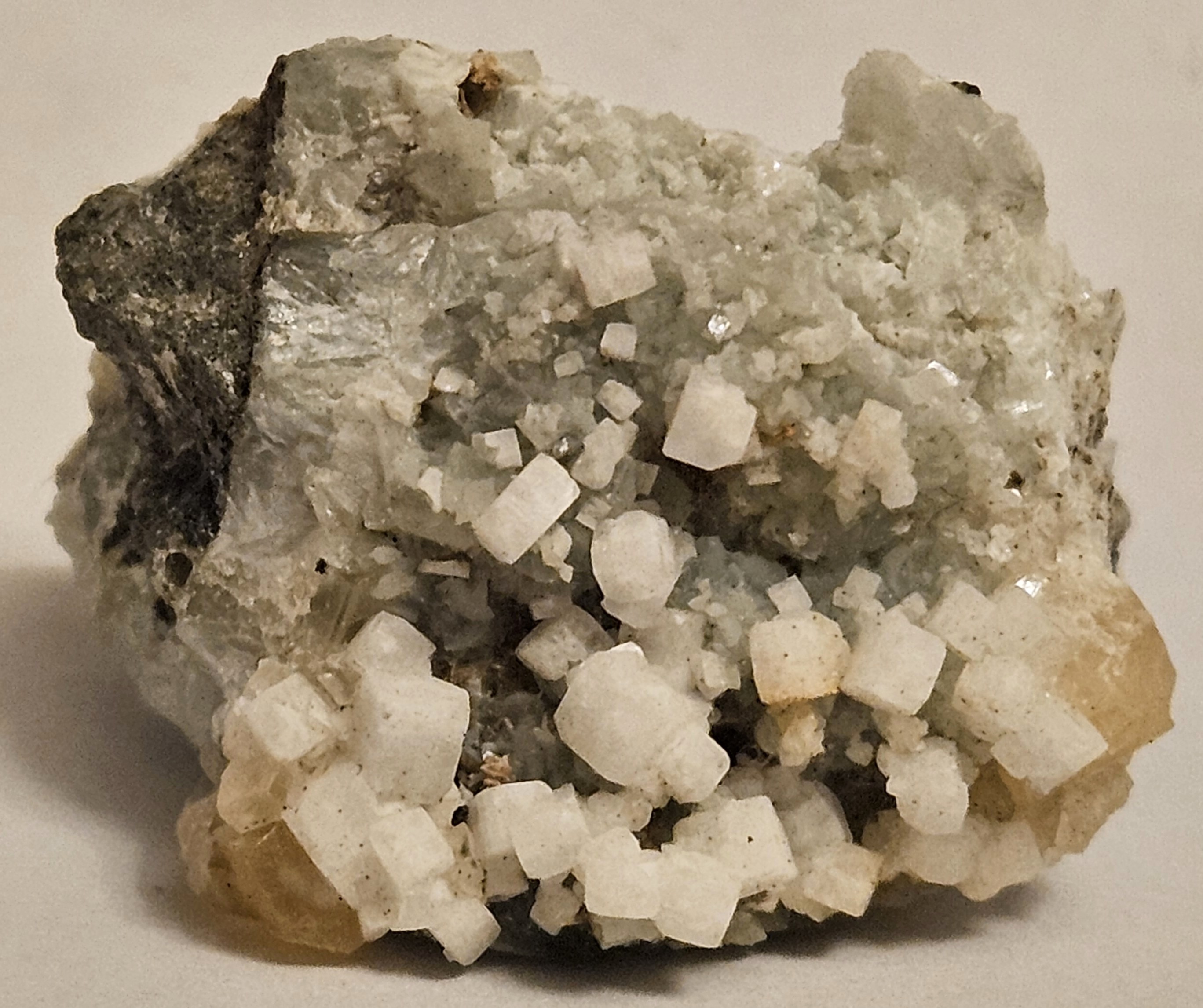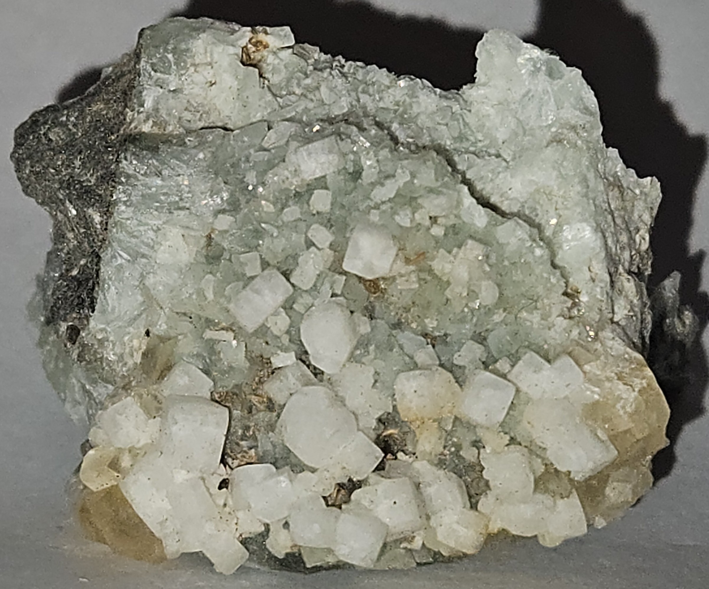 [Glassy White Intergrown Cubic Crystals with Prehnite on Matrix]