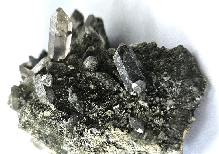 [Pale Brown to Dark Brown Glassy Terminated Crystals with Apatite, Amianthus and Chlorite on Matrix]