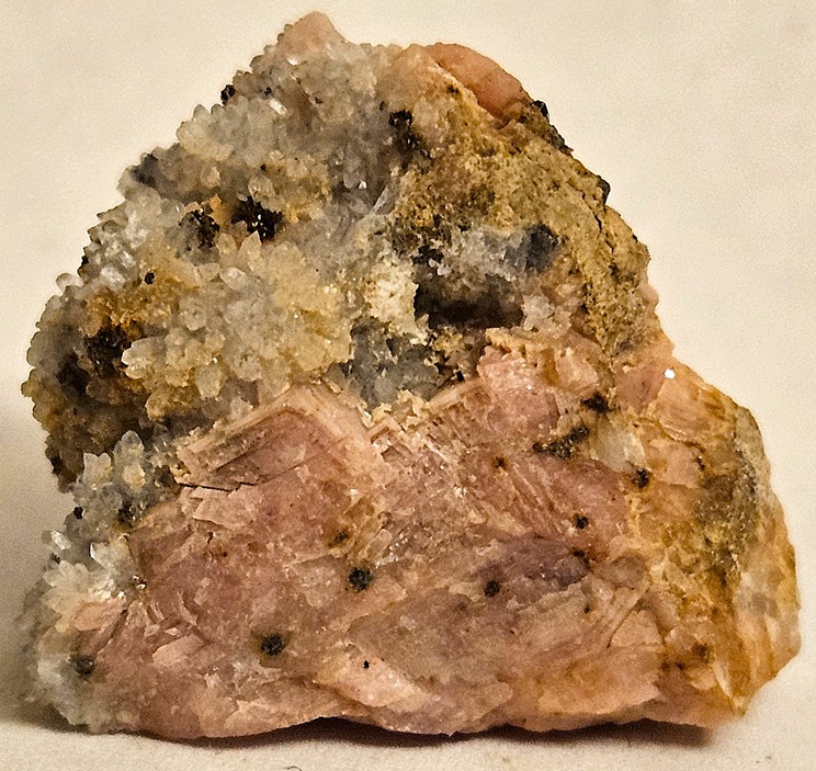 [Salmon-Pink Rhombohedral Crystals with Drusy Quartz]