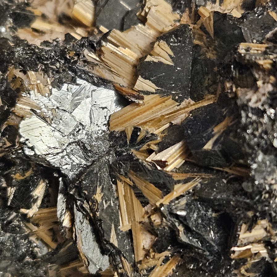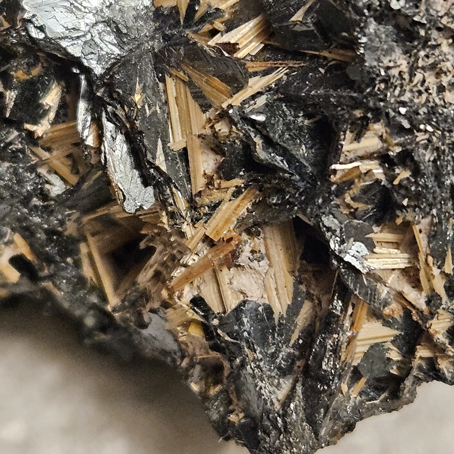 [Lustrous Golden Acicular Crystalline Sheafs on Intergrown Hematite Crystal Plates]