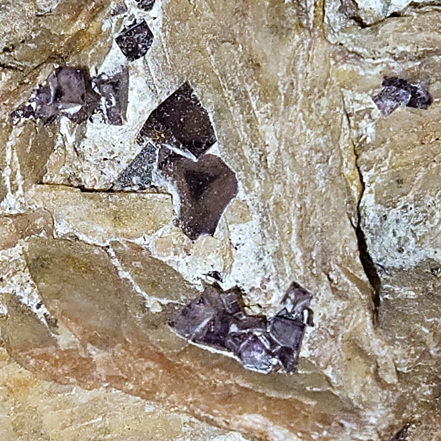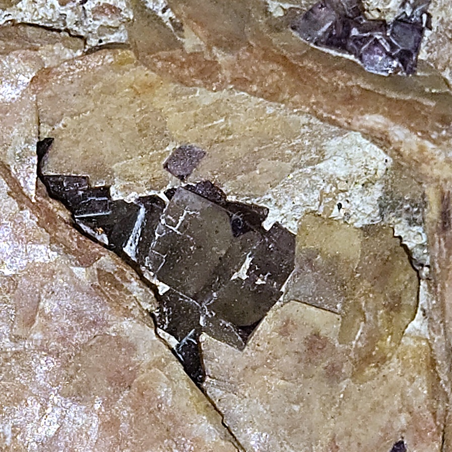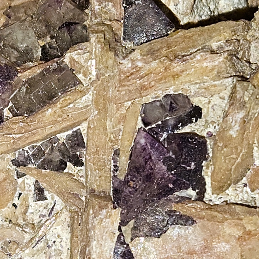 [Glassy Dark Purple Cubic Crystals on Tan Tabular Barite Crystals]
