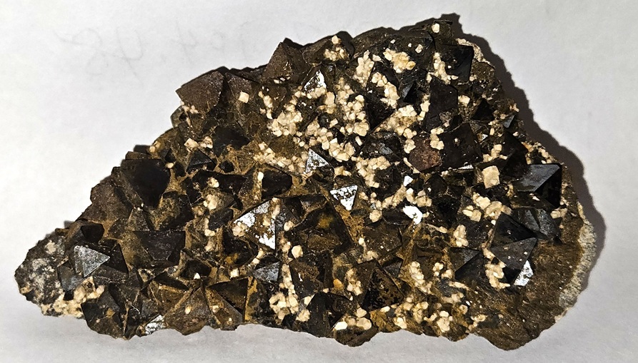 [Lustrous Black Metallic Octahedral Crystals in Calcite]